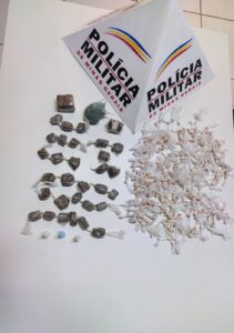 No matagal atrás da estrada onde os suspeitos se deslocavam e durante buscas foi localizada uma sacola contendo 555 (quinhentas e cinquenta e cinco) pedras de substância análoga a crack, que estavam embaladas prontas para serem comercializadas, e outra uma sacola contendo 31 (trinta e uma) buchas de substância análoga a maconha prontas para serem comercializadas.